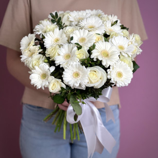 Букет София покорит вас очарованием белоснежных мини-герберов (18 шт), роз (21 шт) и зеленого салала. Это универсальный презент, который можно преподнести на день рождения, годовщину свадьбы, крестины или выпускной.